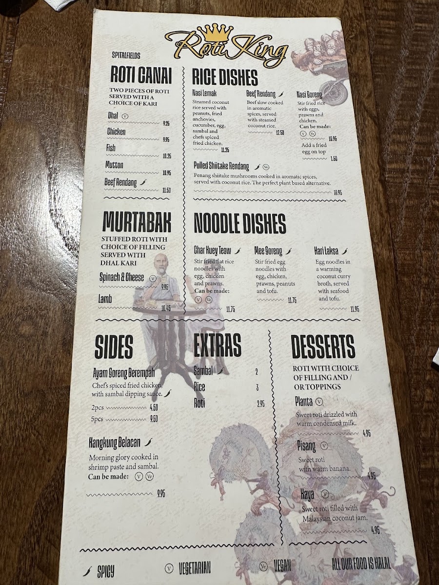 Welcome to Roti King Spitalfields, a delightful gem nestled in the heart of London. Known for its vibrant, laid-back atmosphere, this eatery specializes in Malaysian cuisine, expertly crafted to transport your taste buds. A standout feature is their signature Roti dishes, expertly prepared to perfection. Customers rave about the Roti with Beef Rendang, featuring tender chunks in a creamy sauce that's both rich and unique, moving away from the drier preparations typical of traditional rendang.